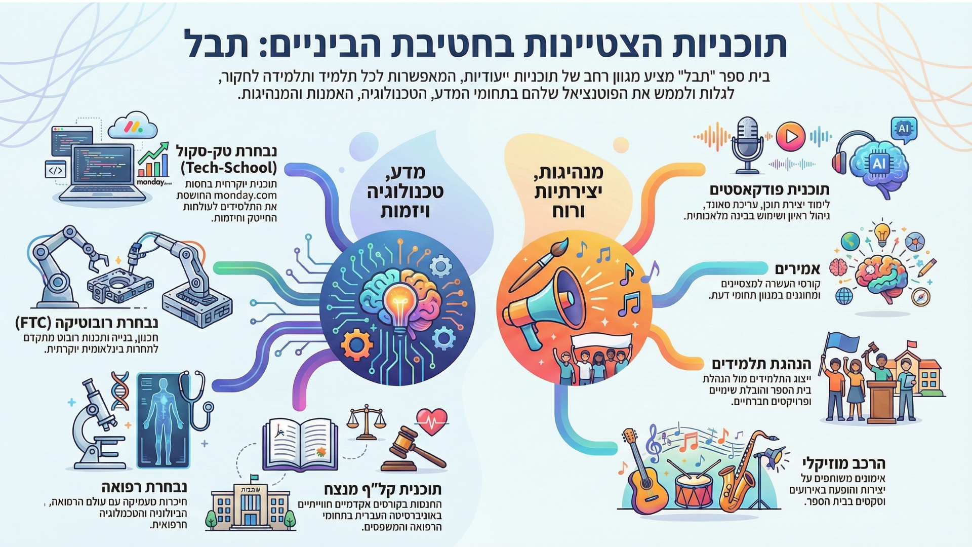 מעבר להישגים לימודיים, אנו שמים דגש רב על פיתוח אישי וחברתי. בית הספר מציע מגוון עשיר של תוכניות חברתיות, פעילויות העשרה, חוגים ויוזמות קהילתיות, המעודדות את התלמידים לפתח מיומנויות חברתיות, לגלות תחומי עניין חדשים ולקחת חלק פעיל בחיי בית הספר והקהילה. אנו מאמינים כי חוויות אלו יוצרות שייכות, משמעות וחיבור אנושי.